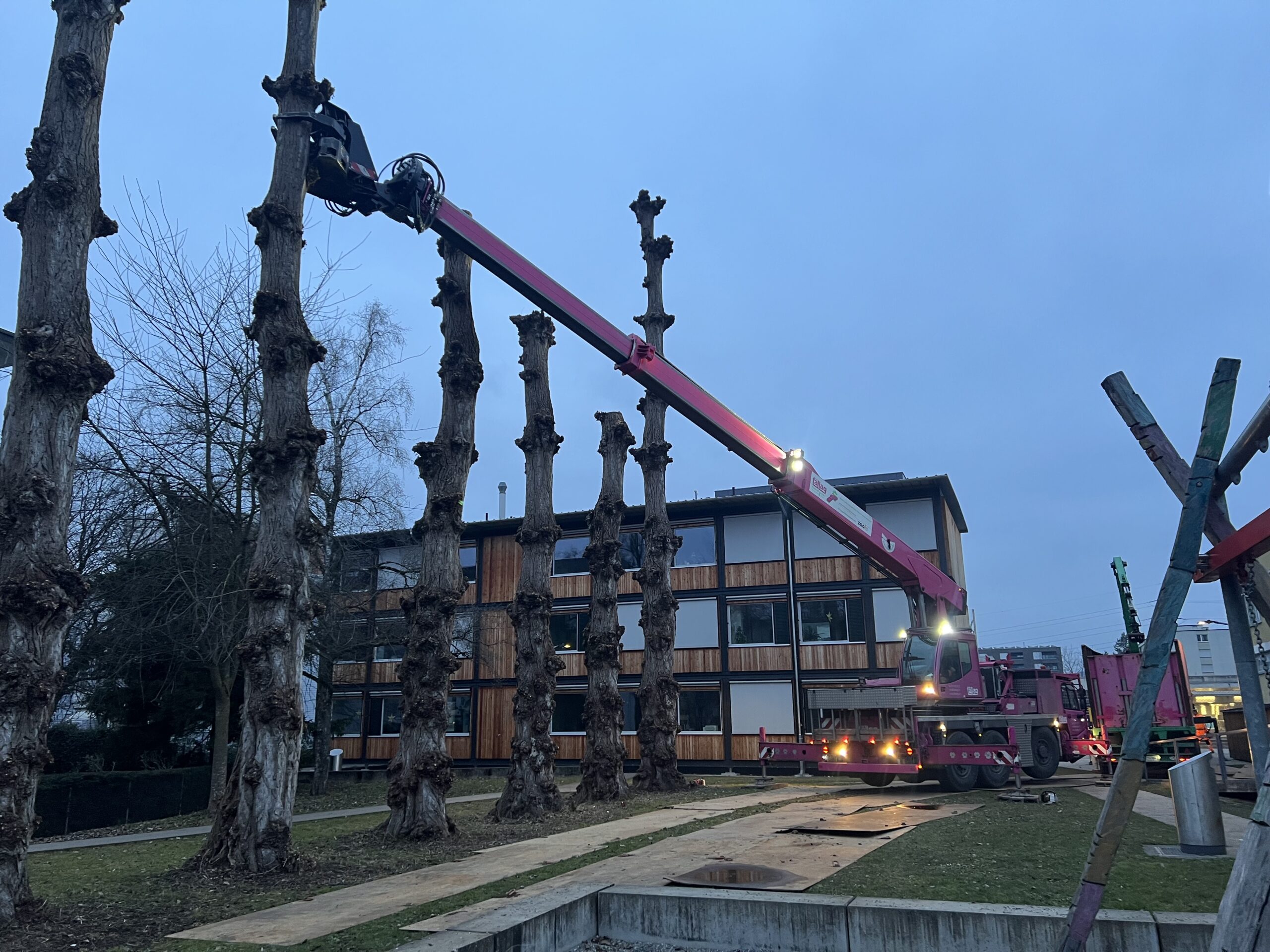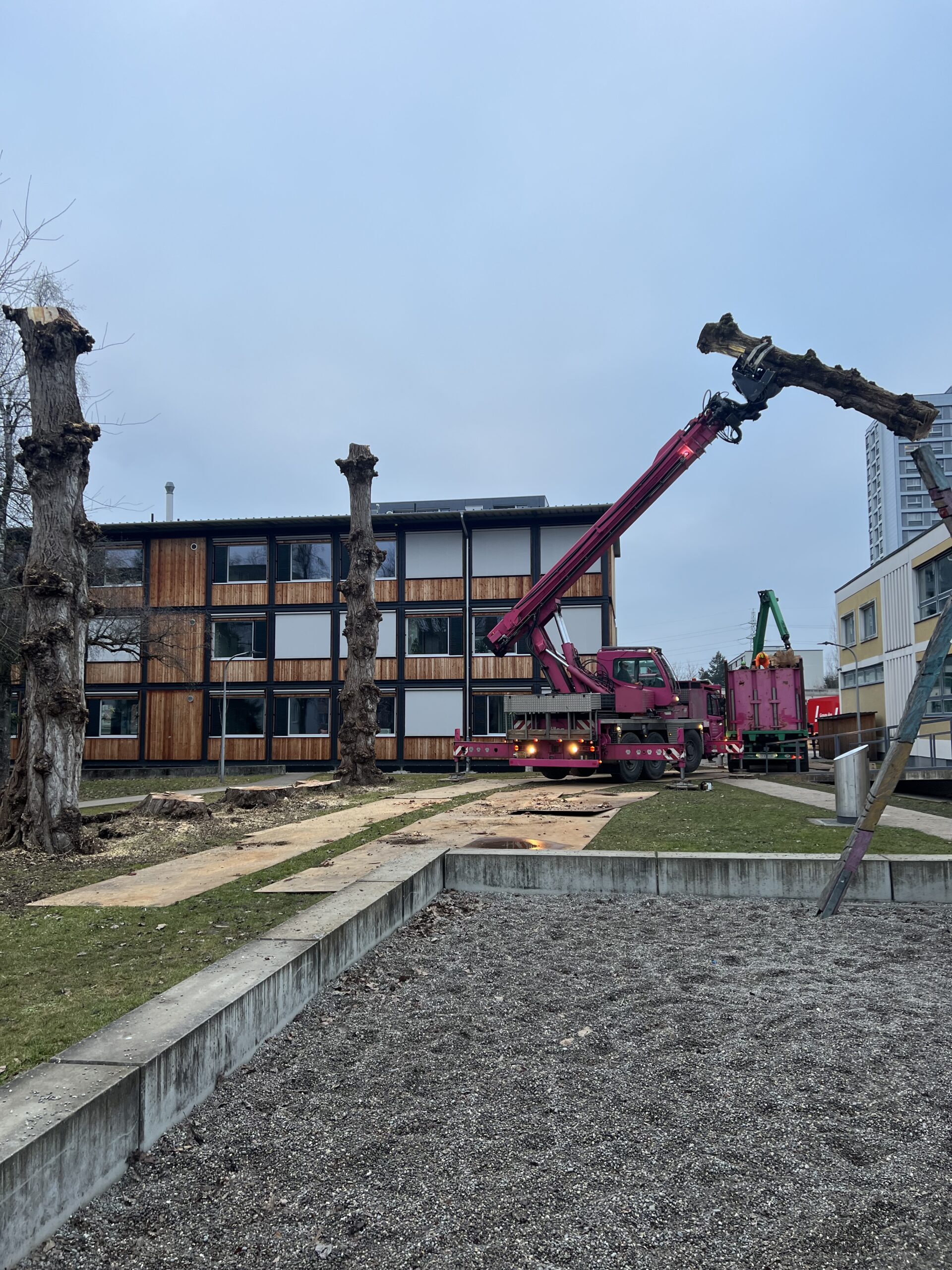 Am besten dann, wenn der Bereich möglichst wenig genutzt wird – und natürlich bevor es gefährlich wird. In diesem Fall wurde die Baumfällung bewusst ausserhalb der Schulzeiten durchgeführt. So blieb der Ablauf sicher, effizient und störungsfrei.