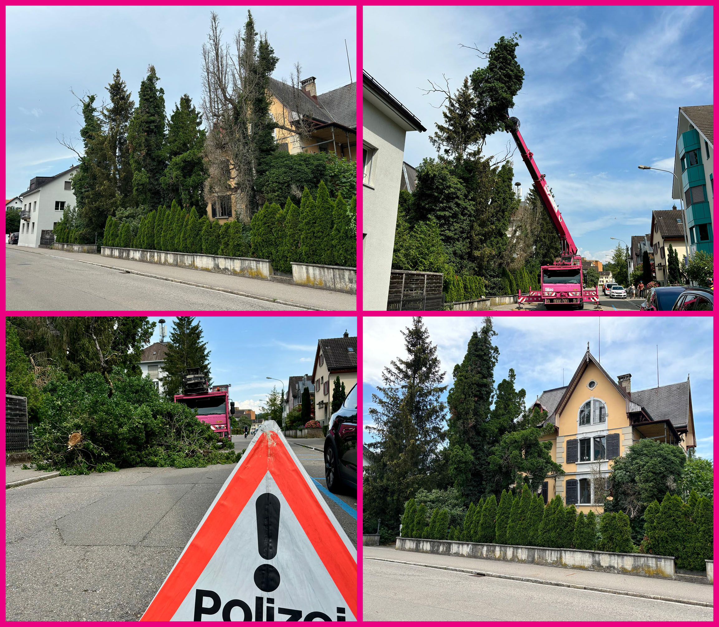 Äste von einem abgestorbenen Baum sind auf die Strasse gefallen. Nach Absprache mit der Polizei und dem Eigentümer, mussten aus Sicherheitsgründen umgehend zwei Bäume gefällt werden.