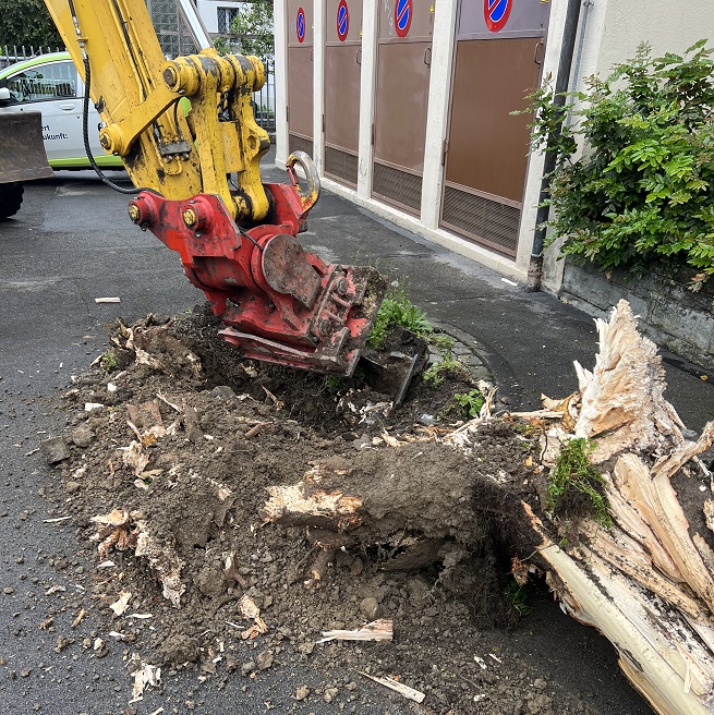 Der Baum musste nicht nur aufgrund der Belagsschäden, sondern auch aus Sicherheitsgründen gefällt werden. Um die Situation nachhaltig zu lösen und weitere Schäden zu verhindern, wurde der Wurzelstock anschliessend fachgerecht entfernt. Erst dadurch konnte der Bereich stabilisiert und wieder sicher nutzbar gemacht werden.